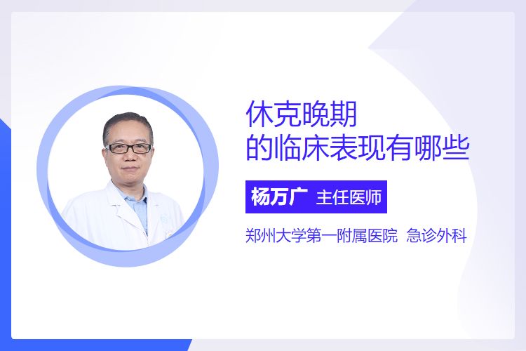 休克晚期(不可逆休克期)的临床表现包括:循环衰竭(血压极低、脉搏细速)、器官功能衰竭(意识障碍、肾功能衰竭)、凝血功能障碍(DIC)、代谢性酸中毒及多器官功能障碍综合征(MODS)。