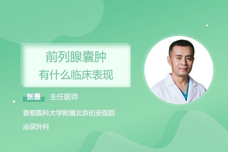 前列腺囊肿临床表现因囊肿大小、位置及有无并发症而异。小囊肿多无症状,常在体检或其他疾病检查时偶然发现;较大囊肿或合并感染者可出现尿频、尿急、排尿困难、尿线细、残余尿增多,甚至尿潴留;部分患者会有会阴部、下腹部隐痛或不适,合并感染时可出现发热、局部疼痛加剧等症状。
