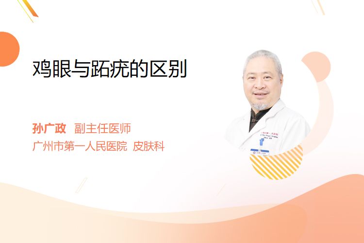 鸡眼与跖疣的区别在于病因和临床表现:鸡眼由长期机械摩擦或压迫导致角质增生,呈圆锥状嵌入皮内,表面光滑,边界清楚,多为单个;跖疣由人乳头瘤病毒感染引起,表面粗糙,有小黑点(血栓形成的小血管),常多发且有传染性。