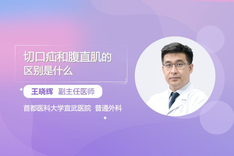 切口疝是腹部手术后常见的病理性疾病,表现为手术切口处腹壁组织缺损导致腹腔内容物突出;腹直肌是腹前壁正中线两侧的纵向肌肉,为正常生理性解剖结构,两者本质不同,前者需临床干预,后者为正常组织。