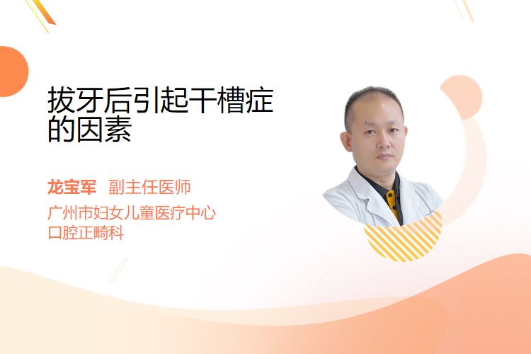 拔牙后干槽症的发生主要与拔牙创伤程度、口腔卫生状态、吸烟饮酒习惯、全身健康状况及血凝块稳定性相关,通常在拔牙后2-3天出现剧烈疼痛、创口腐臭等典型症状。