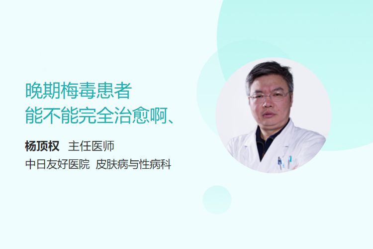 晚期梅毒患者通过规范治疗可有效控制病情、缓解症状,但完全治愈(指病原体完全清除且所有症状永久消失)的可能性因治疗时机和病情阶段而异。早期规范治疗(感染2年内)多数可治愈;晚期(感染超过2年)虽难以完全逆转已造成的组织损伤,但仍可通过治疗控制病情进展,预防并发症。