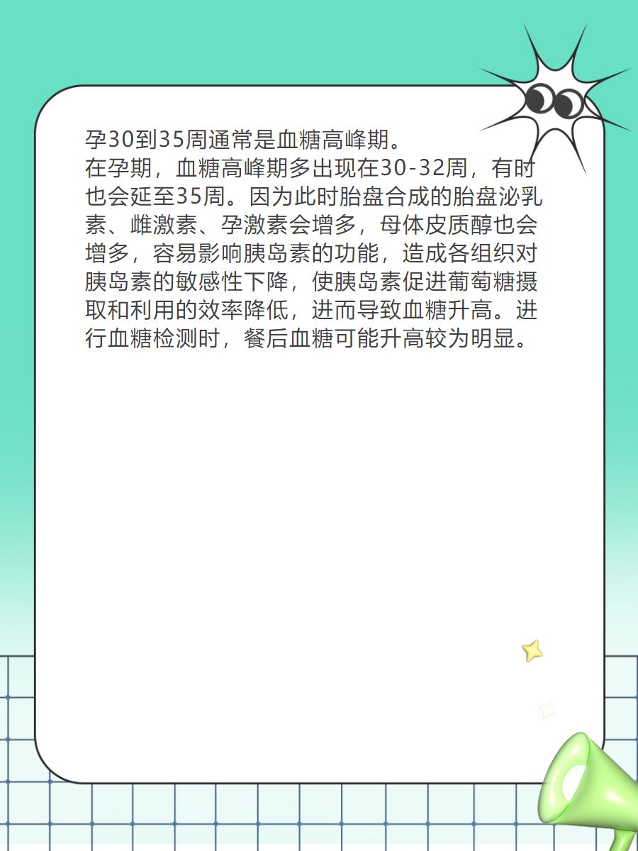 💌女性在怀孕🤰期间,血糖的高峰期一般出现在30-32周之间,但也可能延续至35周。因为在孕期,尤其是孕晚期,随着胎盘合成的各种激素增加⤴️,如胎盘泌乳素、雌激素、孕激素等,以及母体皮质醇的增多,可能会拮抗胰岛素的功能,导致各组织对胰岛素的敏感性下降📉,造成胰岛素促进葡萄糖摄取和利用的效率降低,所以孕妇的血糖会明显升高📈。进行血糖检测时,餐后血糖可能会出现明显异常,因此这一阶段属于血糖高峰期。