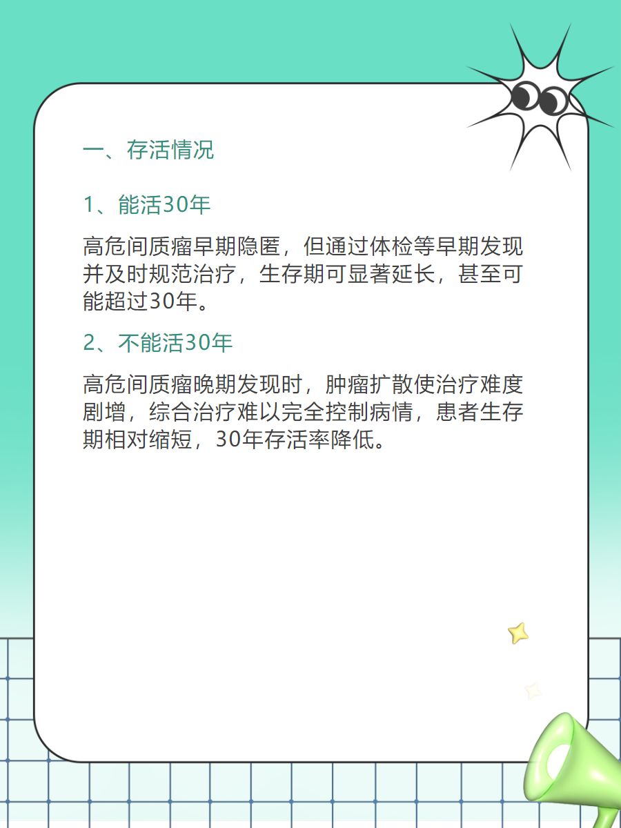 💌高危间质瘤在早期往往没有明显症状,但如果能够通过体检🩺或其他方式早期发现,并立即接受规范治疗,患者的生存期会大大延长,有可能活过30年😊。如果高危间质瘤在晚期才被发现,此时肿瘤可能已经扩散到身体的其他部位,治疗难度会大大增加⤴️。此时,即使采用综合治疗手段,也难以完全控制病情,患者的生存期会相对较短,可能不能❌️存活30年。