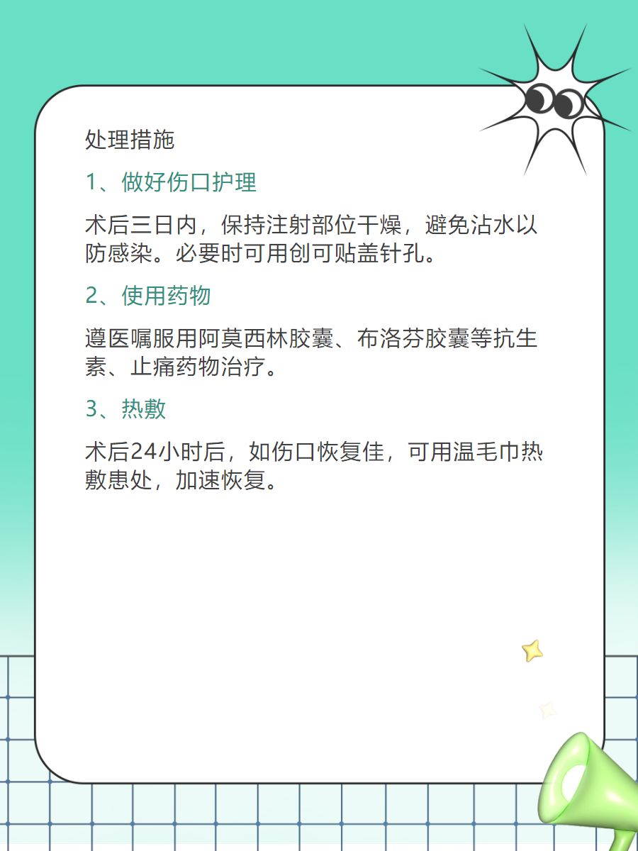 ✅1、术后三天内,注射💉部位不宜沾水💧,需保持针孔处清洁干燥,避免🚫感染。如果有必要,可使用创可贴🩹覆盖针孔。