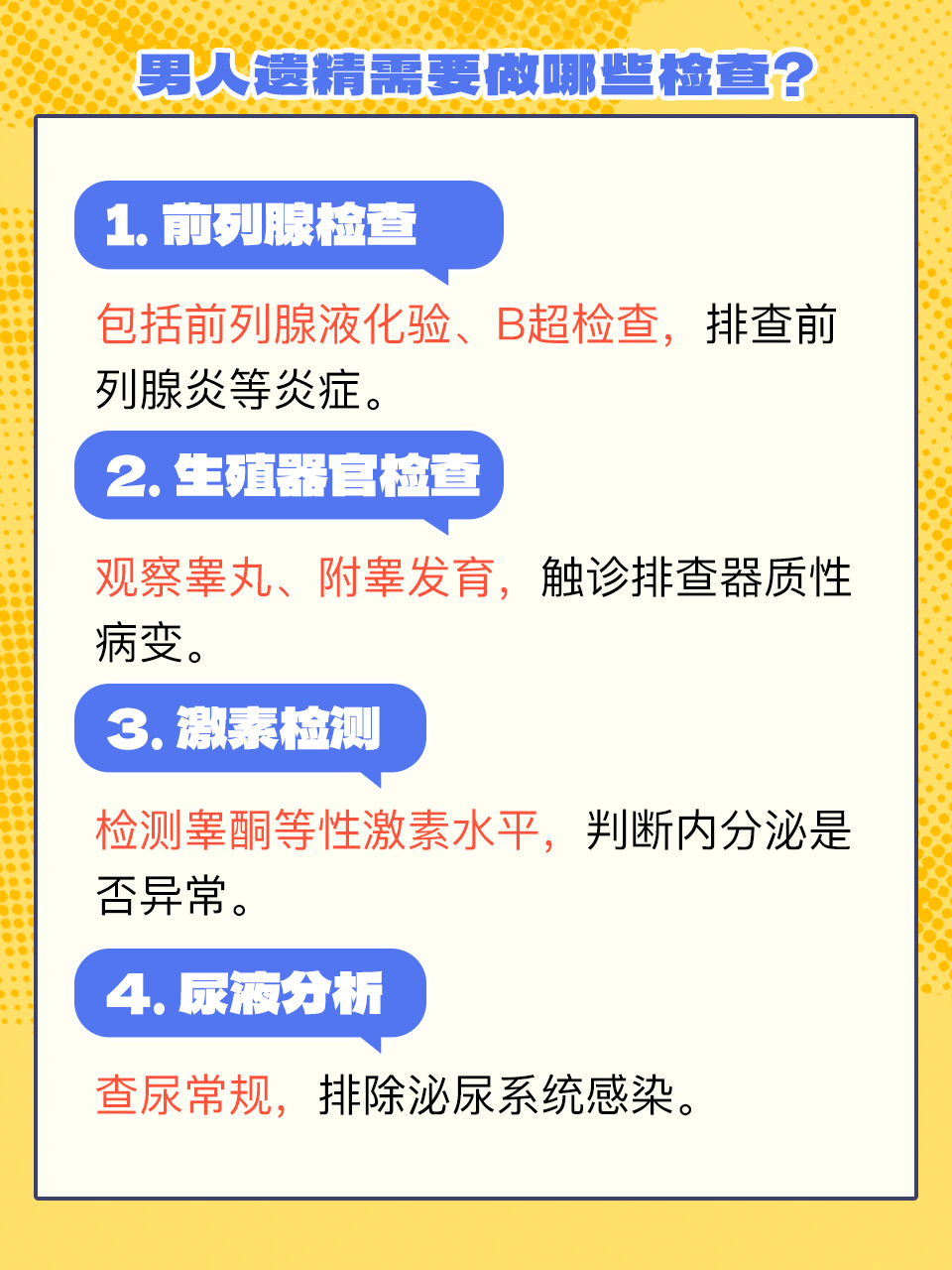⚠️如果遗精过于频繁,或者伴有其他症状,如尿频、尿急、尿痛😣、阳痿、早泄等,可能是疾病引起的,需要及时就医🏥,遵医嘱完善前列腺检查、生殖器官检查、激素检测、尿液分析等检查🔬,以明确病因,进而接受针对性治疗,早日恢复健康。