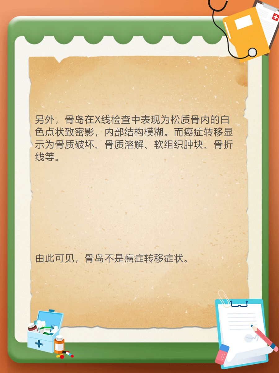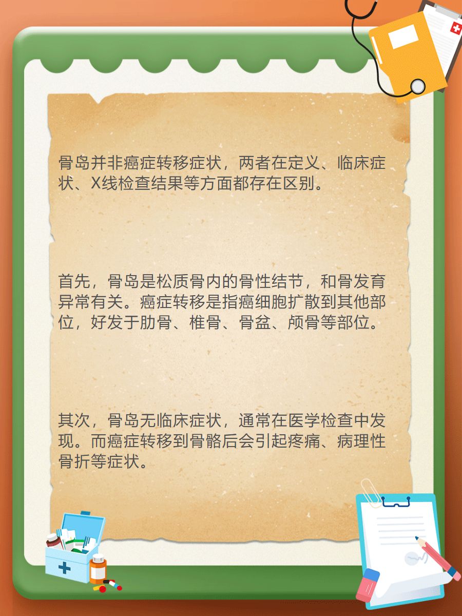 ➡️首先,骨岛是松质骨内的骨性结节,由骨发育异常所致,呈鸟巢状。而癌症转移是指癌细胞从原发部位扩散到身体的其他部位,在骨骼🦴中,主要发生在肋骨、椎骨、骨盆、颅骨等部位。