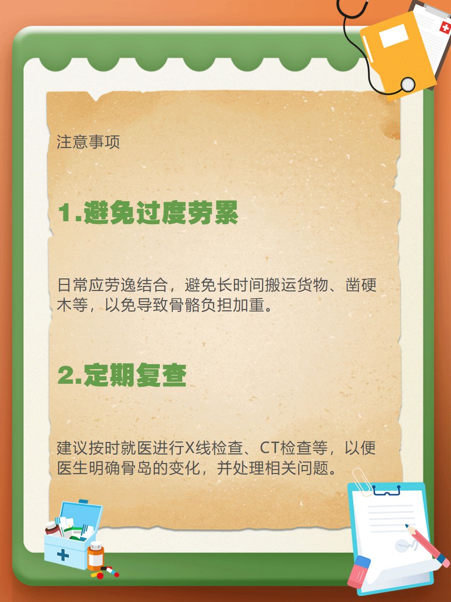 ⚠️2.患者要定期进行复查,复查项目包括X线检查、CT检查等,有助于医生👨⚕️评估骨岛的变化情况,以便及时发现并处理可能出现的问题。
