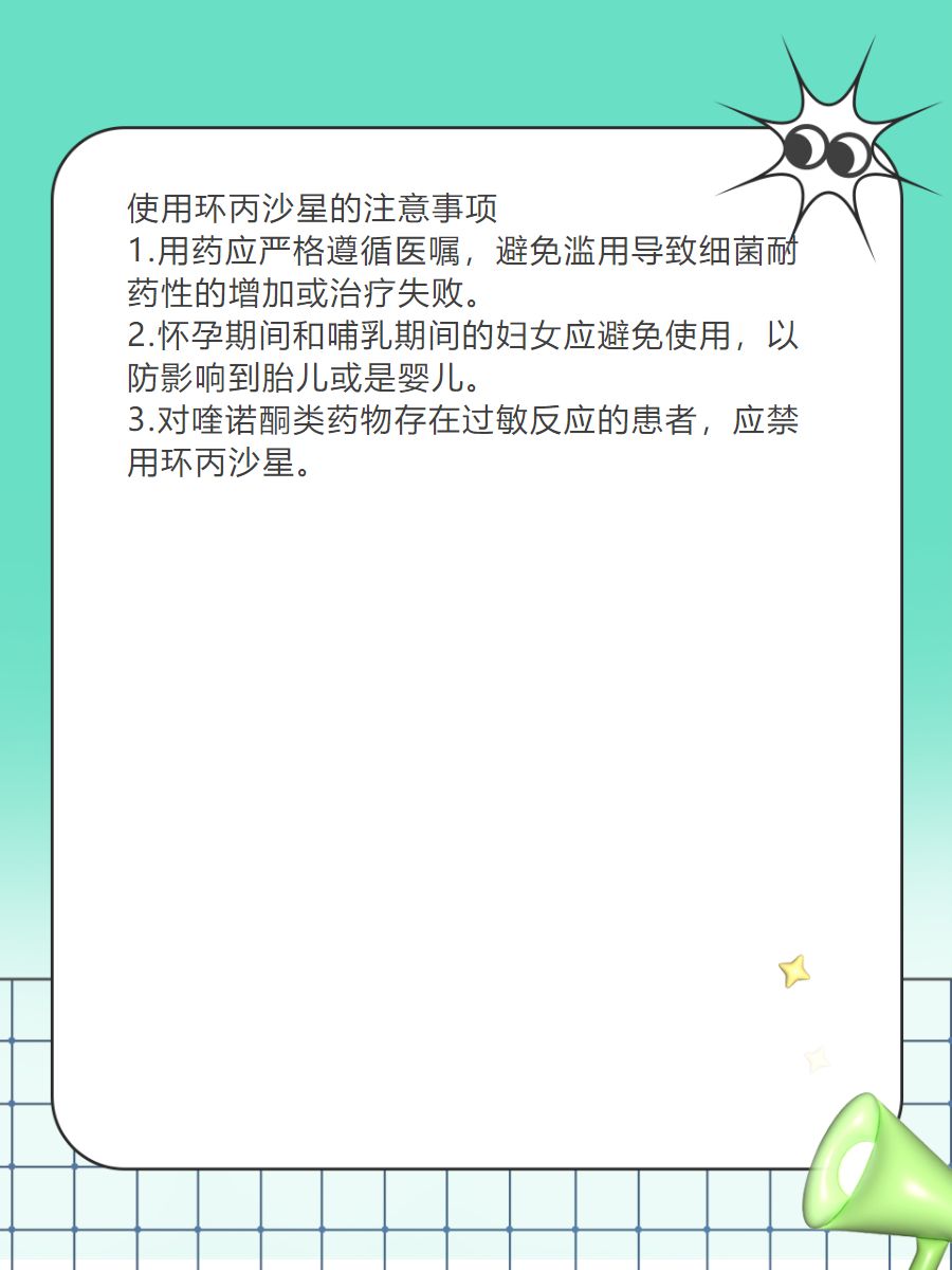 🌺使用环丙沙星或其他抗生素时,也要严格按照医生👩⚕️的指示用药,不可❌️随意增减剂量或停药,以避免🚫耐药性的产生和治疗失败。因该药可能存在对胎儿或婴儿👶的影响,孕妇和哺乳期妇女🤱应避免🚫使用。此外,对喹诺酮类药物💊过敏的患者则应禁用🈲。
